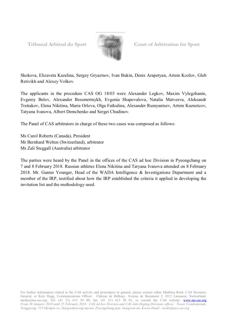 7.19 The Panel appreciates the distress and disappointment expressed by the Applicants present at the hearing about their loss of opportunity to participate at the OWG 2018, particularly because they believe the CAS decisions issued 1 February 2018 proved that they were not “cheaters”. As this Panel has noted, we are only deciding whether the process implemented by the IOC, in circumstances where the ROC was suspended and has failed to rebut the evidence of systemic manipulation of the anti-doping rules and system in Russia, was permissible and provided a fair opportunity for some athletes to be offered an opportunity to participate at the Games. The Panel has determined that the process, while it may have been imperfect due to time constraints, was appropriate, independent and fairly carried out.